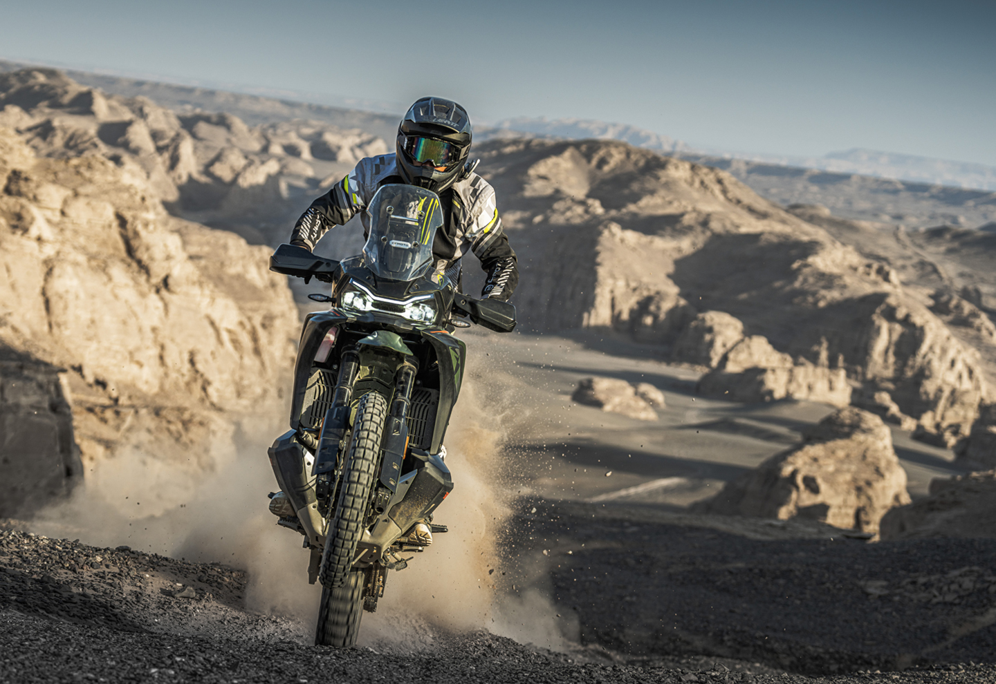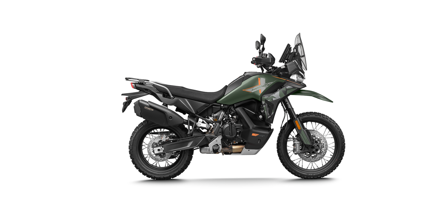 The CFMOTO 1000MT-X equips riders for boundless long haul adventures with cutting-edge technology and advanced rider aids that deliver confidence across every mile. - MT-X family design with an aggressive, rally-inspired front beak, high fender, and muscular tank forms - Narrow upper body and 2-1 seat design improve rider feel and control - seated on road or standing off road - Adjustable windscreen and position-adjustable handlebars enable fine-tuning for rider height and conditions - Full aluminium skid plate & chain guard for durability; robust handguards for brush & weather protection - Twin side-mounted fuel tanks lower the centre of gravity, improve balance, and preserve knee room for stand-up riding