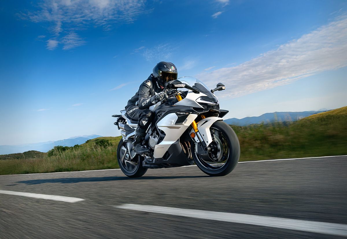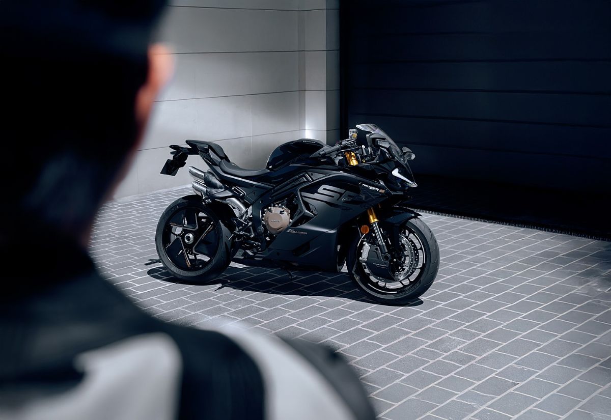 The 750SR-S is a masterpiece of modern motorcycle sculpture - every curve, from its aerodynamic fairing and muscular tank to angular tail, high-mounted quad exhaust, and front wings, blends aggressive performance with timeless elegance. A rolling work of art at just 213kg, with triplespoke rims, single aluminum swingarm, LED lighting, 43mm USD forks, monoshock rear, premium KYB suspension, and Brembo brakes for agile, futuristic style that commands attention day or night